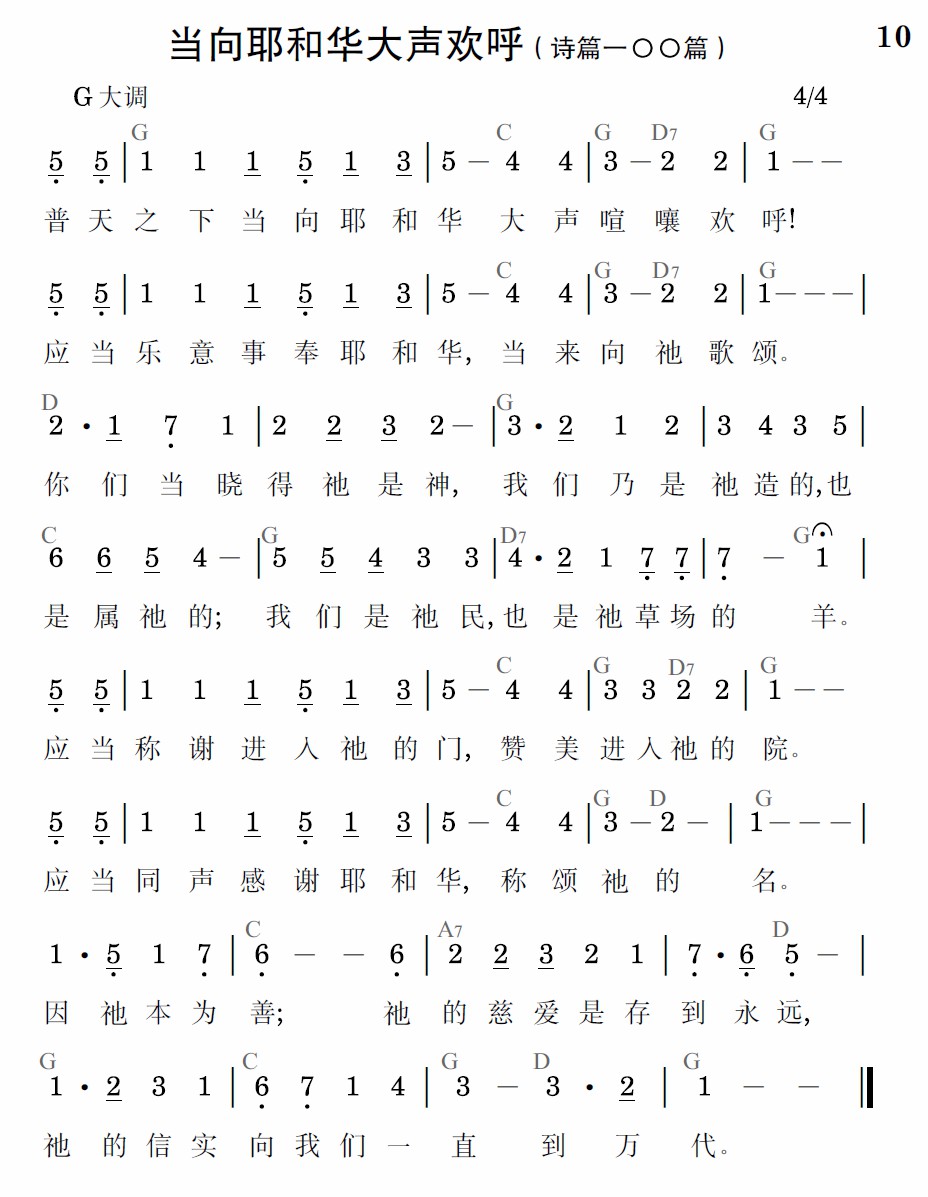 普天之下當向耶和華大聲喧嚷歡呼!應當樂意事奉耶和華,當來向祂歌頌。你們當曉得祂是神,我們乃是祂造的,也是屬祂的;我們是祂民,也是祂草場的羊。應當稱謝進入祂的門,讚美進入祂的院。應當同聲感謝耶和華,稱頌祂的名。因祂本為善;祂的慈愛是存到永遠,祂的信實向我們一直到萬代。