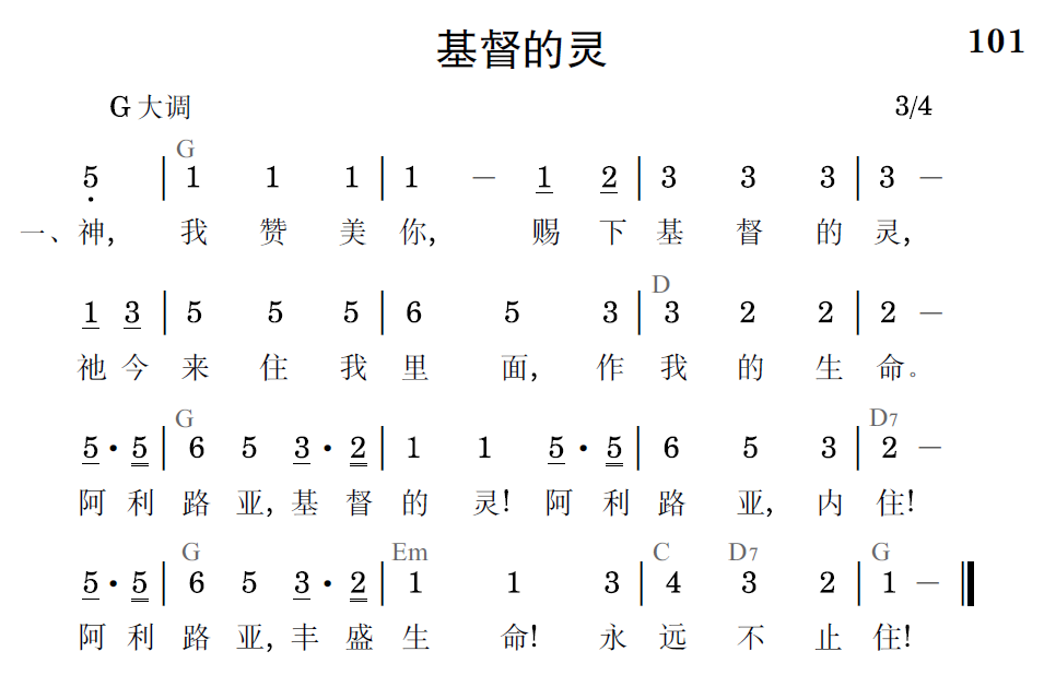神,我讚美你,賜下基督的靈,祂今來住我裡面,作我的生命。阿利路亞,基督的靈!阿利路亞,內住!阿利路亞,豐盛生命!永遠不止住!