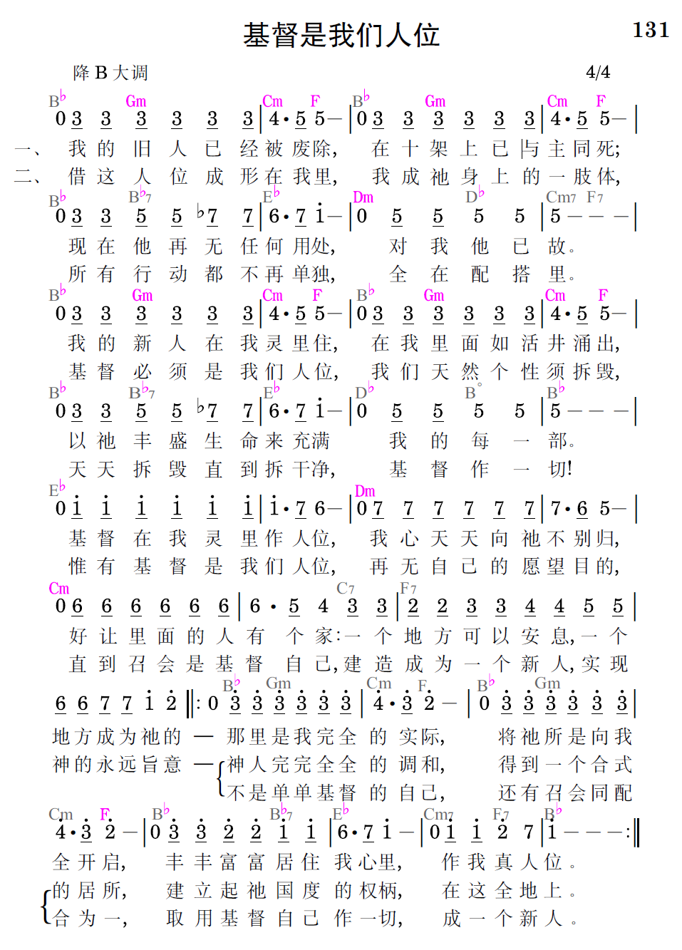 我的舊人已經被廢除,在十架上已與主同死;現在他再無任何用處,對我他已故。我的新人在我靈裡住,在我裡面如活井湧出,以祂豐盛生命來充滿我的每一部。基督在我靈裡作人位,我心天天向祂不別歸,好讓裡面的人有個家:一個地方可以安息,一個地方成為祂的——那裡是我完全的實際,將祂所是向我全開啟,豐豐富富居住我心裡,作我真人位。