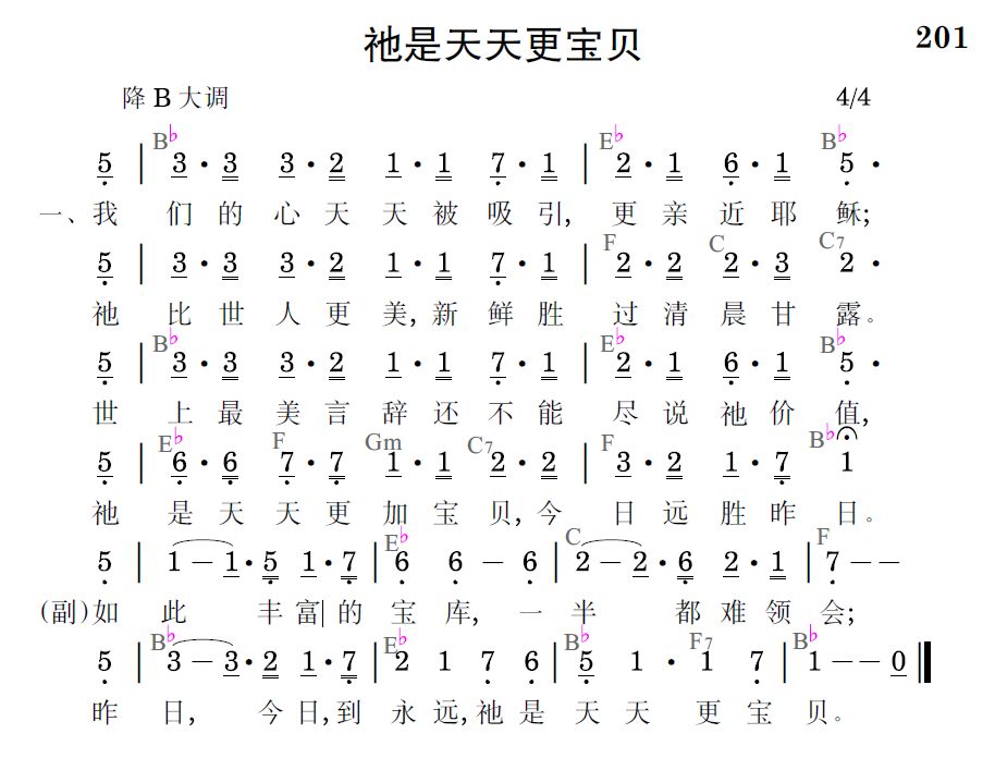 我們的心天天被吸引,更親近耶穌;祂比世人更美,新鮮勝過清晨甘露。世上最美言辭還不能盡說祂價值,祂是天天更加寶貝,今日遠勝昨日。