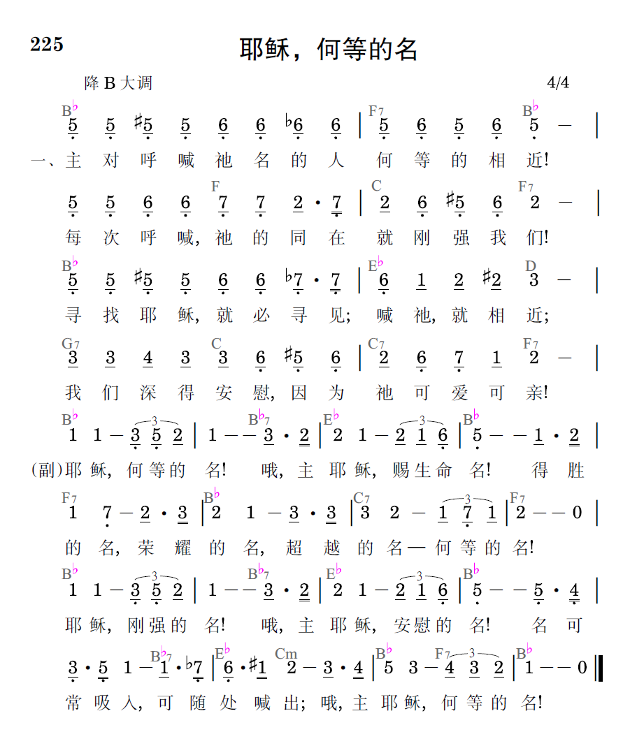 耶穌,何等的名!哦,主耶穌,賜生命名!得勝的名,榮耀的名,超越的名——何等的名!耶穌,剛強的名!哦,主耶穌,安慰的名!名可常吸入,可隨處喊出;哦,主耶穌,何等的名!