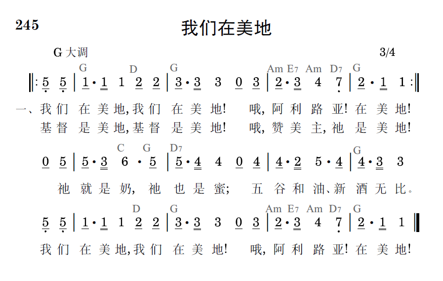 我們在美地,我們在美地!哦,阿利路亞!在美地!基督是美地,基督是美地!哦,讚美主,祂是美地!祂就是奶,祂也是蜜;五穀和油、新酒無比。我們在美地,我們在美地!哦,阿利路亞!在美地!
