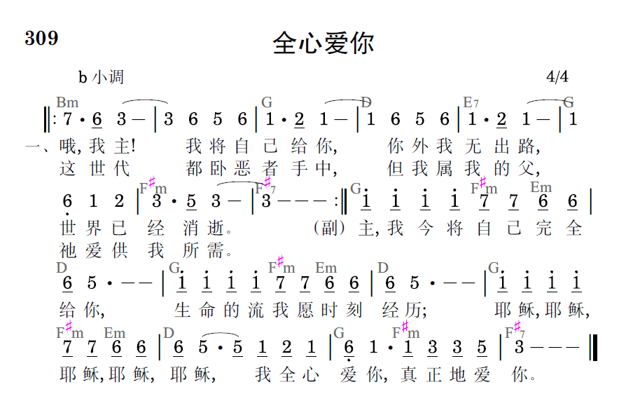 主,我今將自己完全給你,生命的流使我讚美不已;耶穌,耶穌,耶穌,耶穌,耶穌,我全心愛你,真正的愛你。