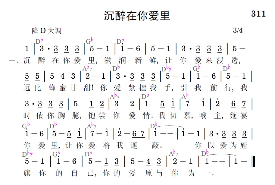 沉醉在你愛裡,滋潤新鮮,讓你愛來浸透,遠比蜂蜜甘甜!你愛緊握我手,引我前行,我時依你胸臆,飽嘗你愛情。我切慕,哦主,筵宴你愛裡,讓你愛將我遮蔽。你以愛為旌旗——你的自己,你的愛原與你為一。