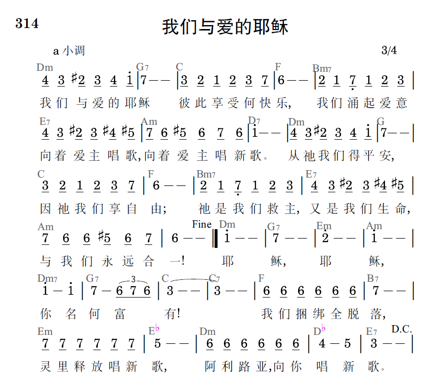 我們與愛的耶穌彼此享受何快樂,我們湧起愛意向著愛主唱歌,向著愛主唱新歌。從祂我們得平安,因祂我們享自由;祂是我們救主,又是我們生命,與我們永遠合一!我們與愛的耶穌彼此享受何快樂,我們湧起愛意向著愛主唱歌,向著愛主唱新歌。從祂我們得平安,因祂我們享自由;祂是我們救主,又是我們生命,與我們永遠合一!耶穌,耶穌,你名何富有!我們捆綁全脫落,靈裡釋放唱新歌,阿利路亞向你唱新歌。
