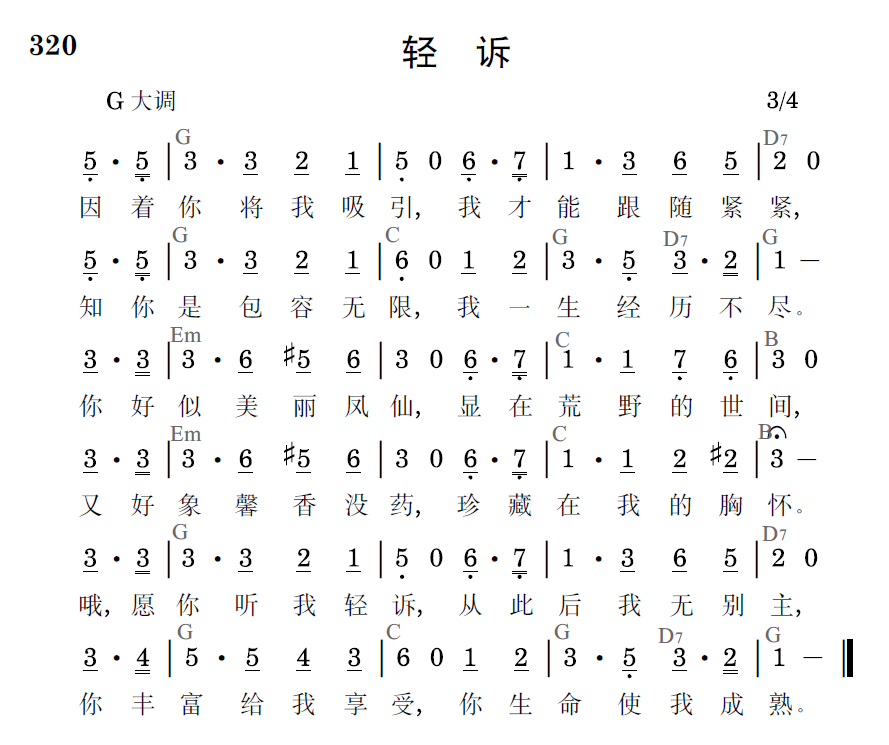 因著你將我吸引,我才能跟隨緊緊,知你是包容無限,我一生經歷不盡。你好似美麗鳳仙,顯在荒野的世間,又好像馨香沒藥,珍藏在我的胸懷。哦,願你聽我輕訴,從此後我無別主,你豐富給我享受,你生命使我成熟。