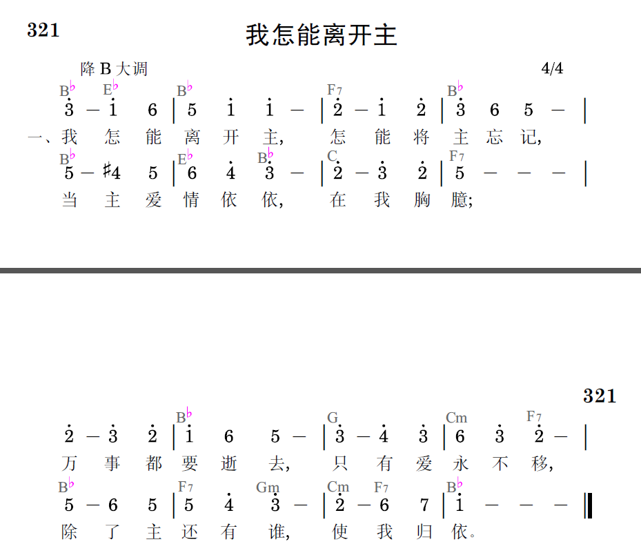 我怎能離開主,怎能將主忘記,當主愛情依依,在我胸臆;萬事都要逝去,只有愛永不移,除了主還有誰,使我歸依。
