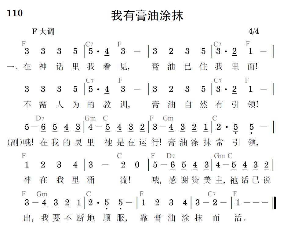 哦!在我的靈裡祂是在運行!膏油塗抹常引領,神在我裡湧流!哦,感謝讚美主,祂話已說出,我要不斷的順服,靠膏油塗抹而活。