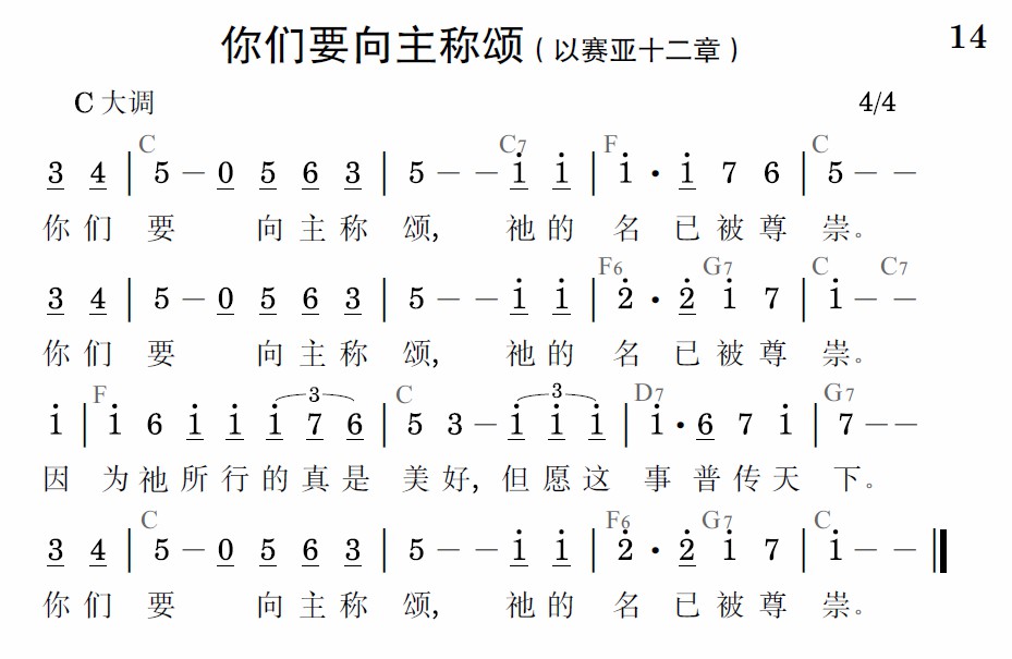 你們要向主稱頌,祂的名已被尊崇。你們要向主稱頌,祂的名已被尊崇。因為祂所行的真是美好,但願這事普傳天下。你們要向主稱頌,祂的名已被尊崇。