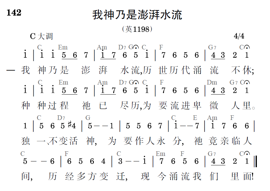 我神乃是澎湃水流,歷世歷代湧流不休;種種過程祂已盡歷,為要流進卑微人裡。獨一不變活神,為要作人永分,祂竟親臨人間,歷經多方變遷,現今湧流我們裡面!