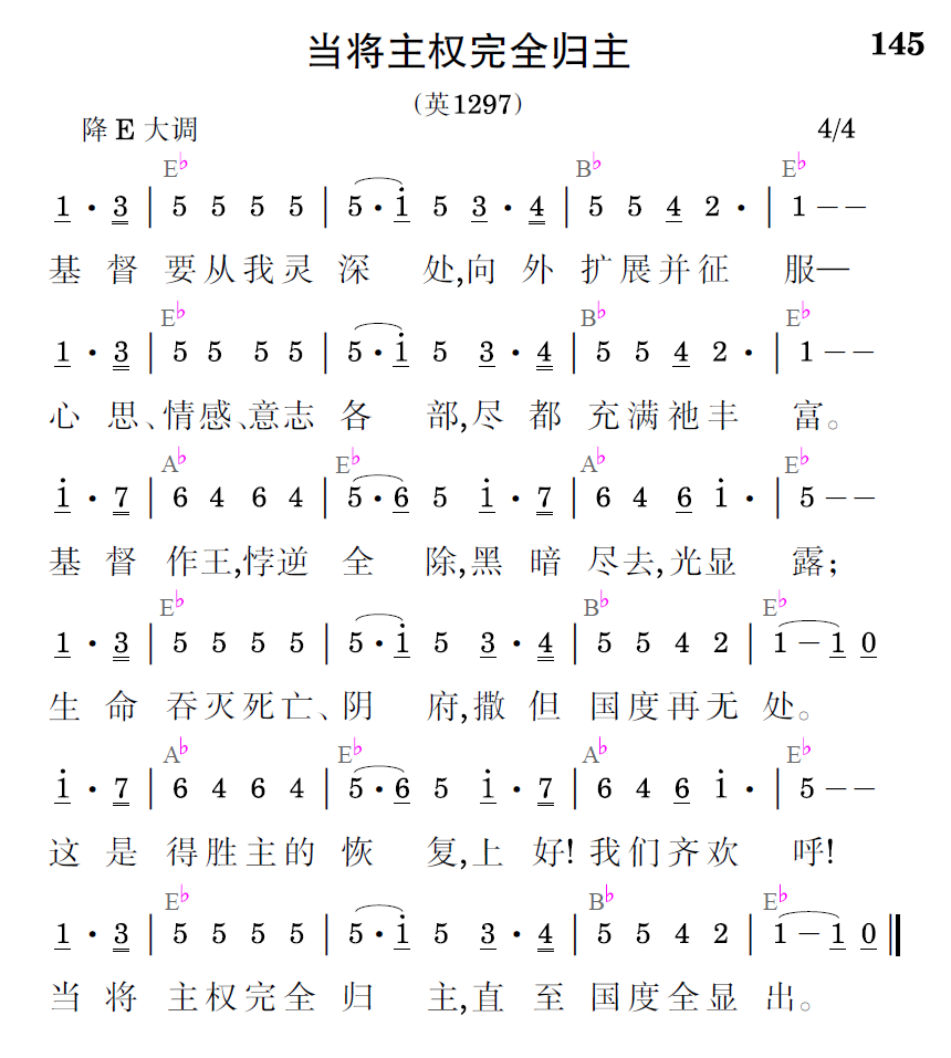 基督要從我靈深處,向外擴展並征服——心思、情感、意志各部,盡都充滿祂豐富。基督作王,悖逆全除,黑暗盡去,光顯露;生命吞滅死亡、陰府,撒但國度再無處。這是得勝主的恢復,上好!我們齊歡呼!當將主權完全歸主,直至國度全顯出。