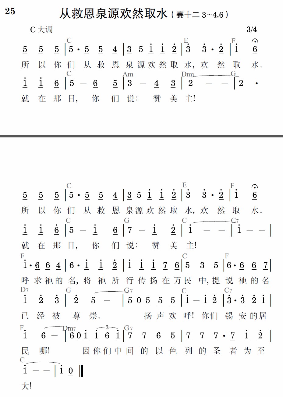 所以你們從救恩泉源歡然取水,歡然取水。就在那日,你們說:讚美主!所以你們從救恩泉源歡然取水,歡然取水。就在那日,你們說:讚美主!呼求祂的名,將祂所行傳揚在萬民中,題說祂的名已經被尊崇。揚聲歡呼!你們錫安的居民哪!因你們中間的以色列的聖者為至大!