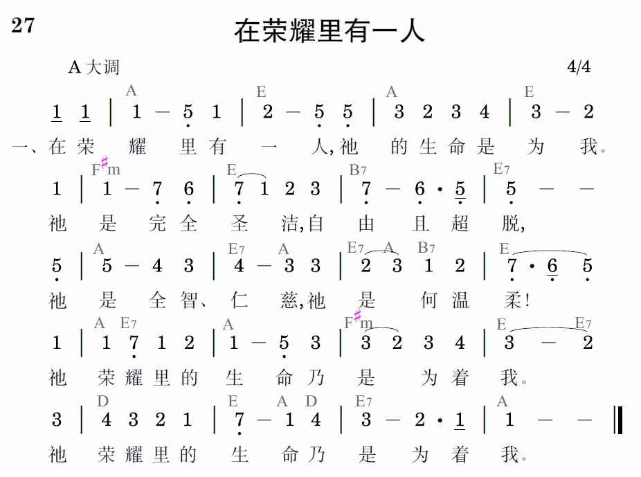 在榮耀裡有一人,祂的生命是為我。祂是完全聖潔,自由且超脫,祂是全智、仁慈,祂是何溫柔!祂榮耀裡的生命乃是為著我。祂榮耀裡的生命乃是為著我。