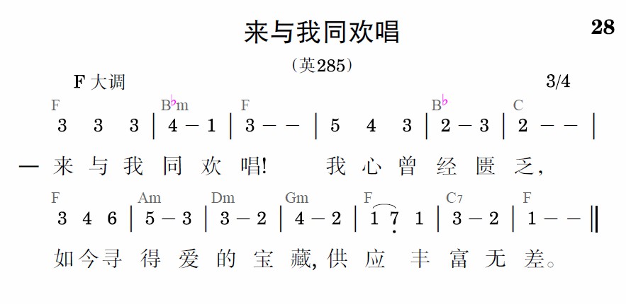 來與我同歡唱!我心曾經匱乏,如今尋得愛的寶藏,供應豐富無差。