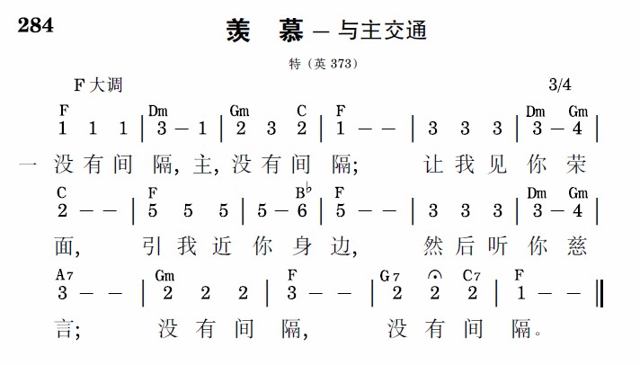 沒有間隔,主,沒有間隔;讓我見你榮面,引我近你身邊,然後聽你慈言;沒有間隔,沒有間隔。