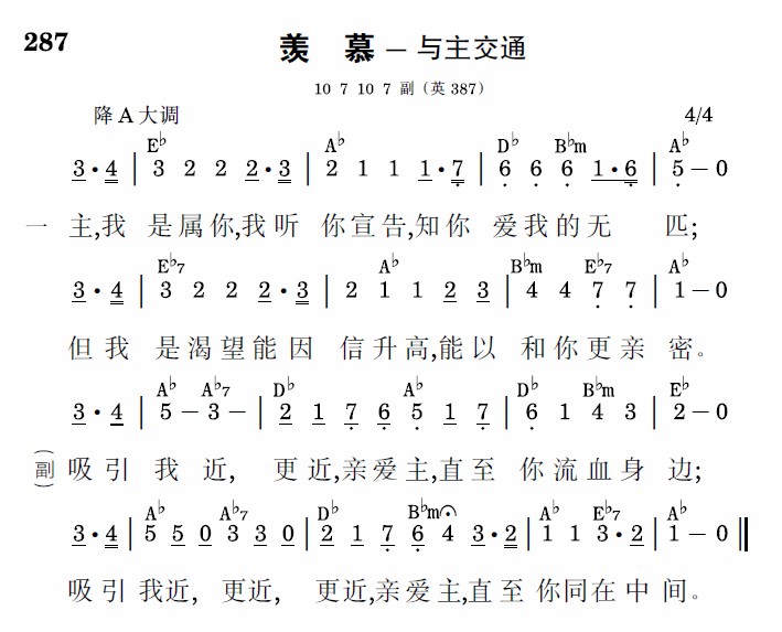 吸引我近,更近,親愛主,直至你流血身邊;吸引我近,更近,更近,親愛主,直至你同在中間。