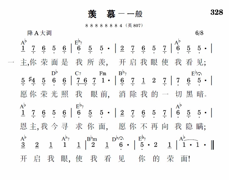 主,你榮面是我所羨,開啟我眼使我看見;願你榮光照我眼前,消除我的一切黑暗。恩主,我今尋求你面,願你不再向我隱瞞;開啟我眼,使我看見你的榮面!