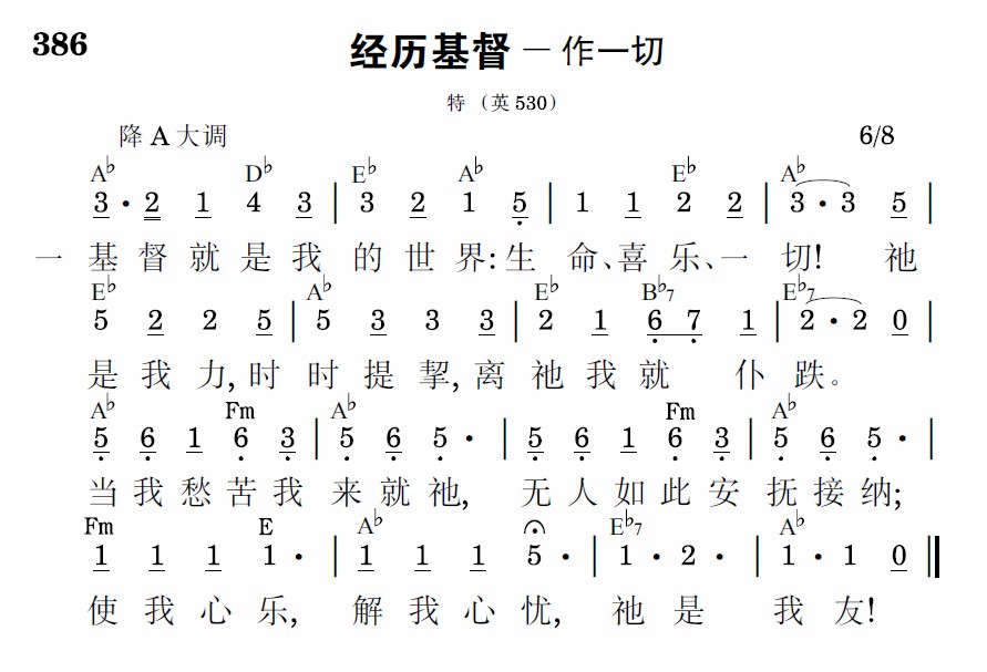 基督就是我的世界:生命、喜樂、一切!祂是我力,時時提挈,離祂我就仆跌。當我愁苦我來就祂,無人如此安撫接納;使我心樂,解我心憂,祂是我友!