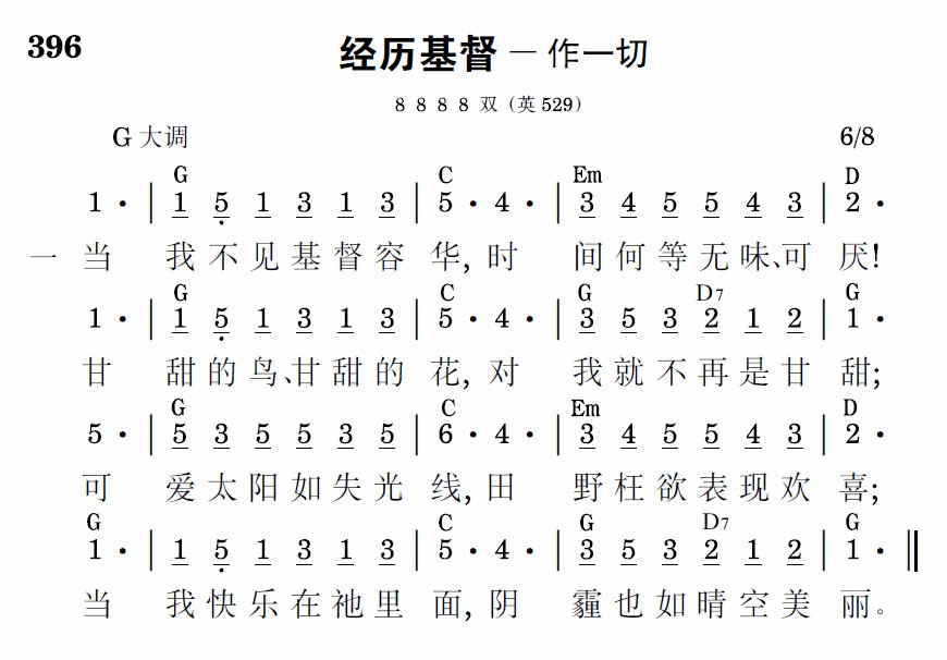 看見祂面我就甘甜,我就只求祂的歡喜,不論時地有何改變,不能改變我的心意;只要感覺祂的愛戀,宮殿也成可笑玩具,監獄可成榮耀宮殿,如果基督和我同居。