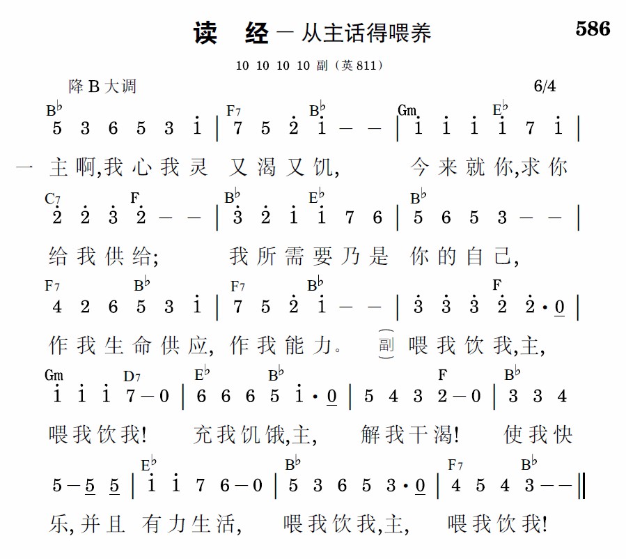 餵我飲我,主,餵我飲我!充我飢餓,主,解我乾渴!使我快樂,並且有力生活,餵我飲我,主,餵我飲我!