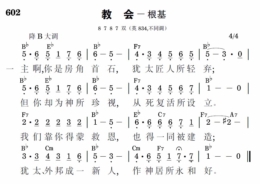 主啊,你是房角首石,猶太匠人所輕棄;但你卻為神所珍視,從死復活所設立。我們靠你得蒙救恩,也得一同被建造;猶太、外邦成一新人,作神居所永和好。