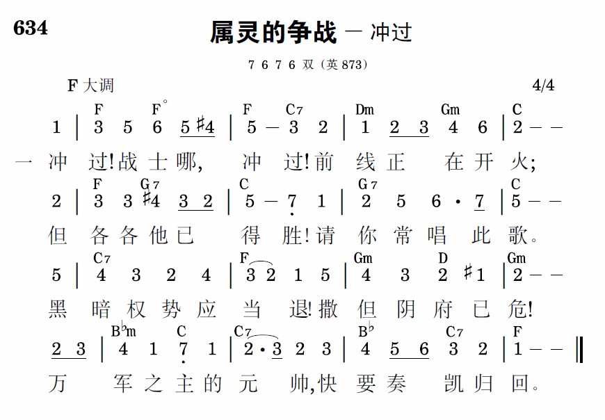 衝過!戰士哪,衝過!前線正在開火;但各各他已得勝,請你常唱此歌。黑暗權勢應當退,撒但陰府已危!萬軍之主的元帥,快要奏凱歸回。