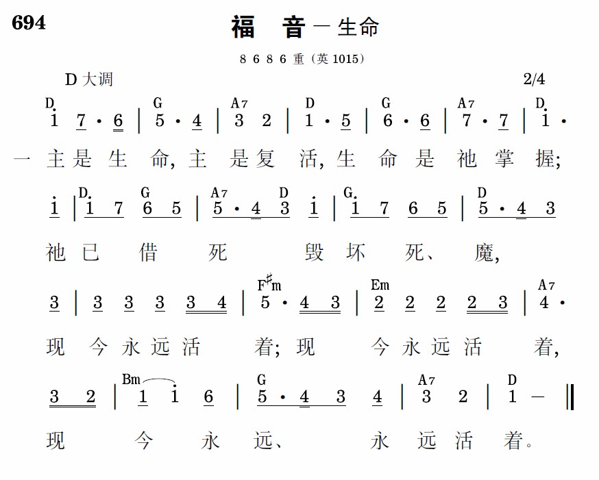 主是生命,主是復活,生命是祂掌握;祂已借死毀壞死、魔,現今永遠活著;現今永遠活著,現今永遠、永遠活著。