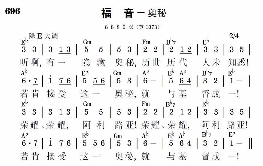 聽啊,有一隱藏奧秘,歷世歷代人未知悉!若肯接受這一奧秘,就與基督成一!榮耀、榮耀,阿利路亞!榮耀、榮耀,阿利路亞!若肯接受這一奧秘,就與基督成一!