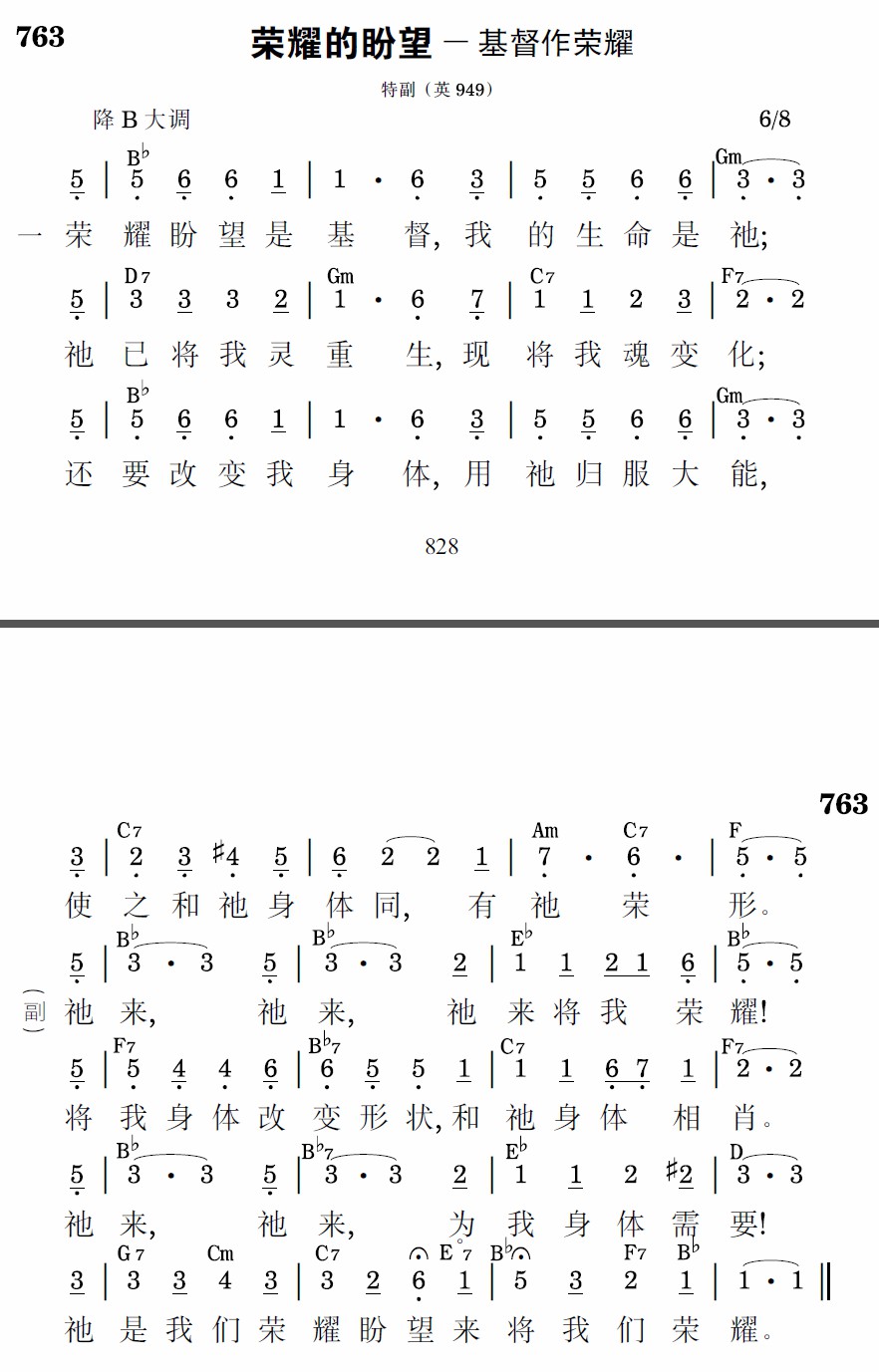 榮耀盼望是基督,我的生命是祂;祂已將我靈重生,現將我魂變化;還要改變我身體,用祂歸服大能,使之和祂身體同,有祂榮形。