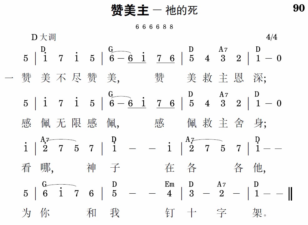讚美不盡讚美,讚美救主恩深;感佩無限感佩,感佩救主捨身;看哪,神子在各各他,為你和我釘十字架。