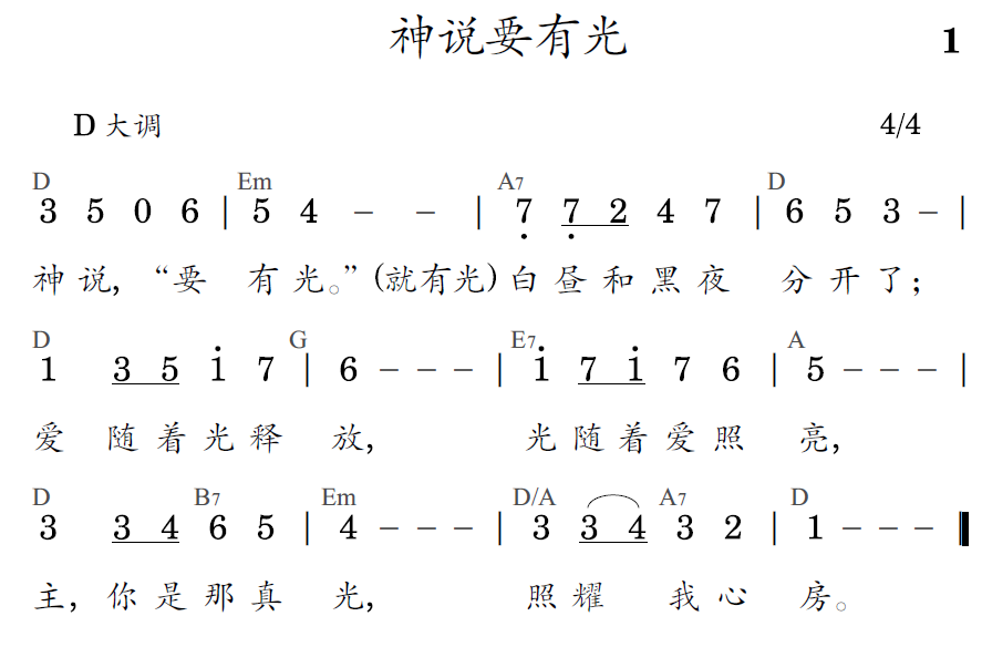 神說,『要有光。』(就有光)白晝和黑夜分開了;愛隨著光釋放,光隨著愛照亮,主,你是那真光,照耀我心房。