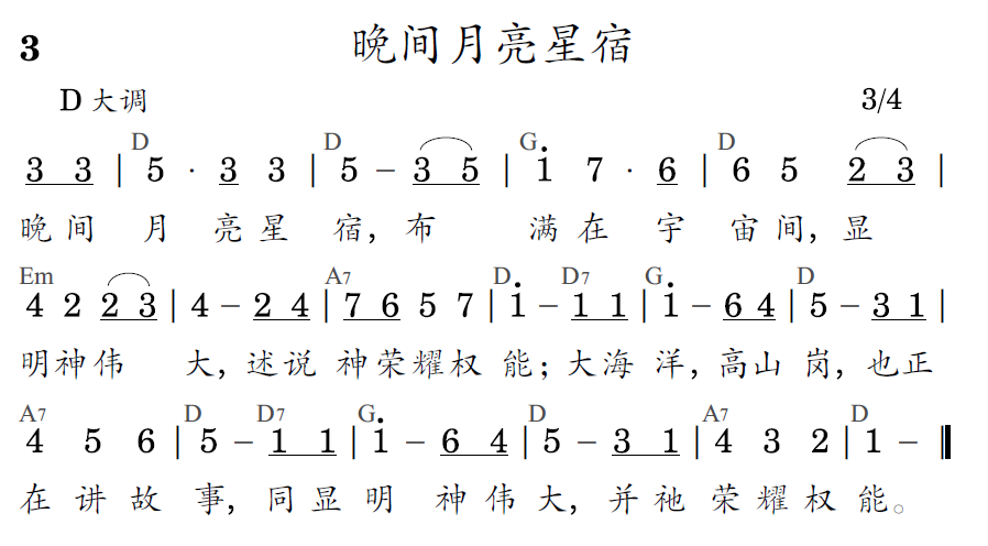 晚間月亮星宿,佈滿在宇宙間,顯明神偉大,述說神榮耀權能;大海洋,高山崗,也正在講故事,同顯明神偉大,並祂榮耀權能。